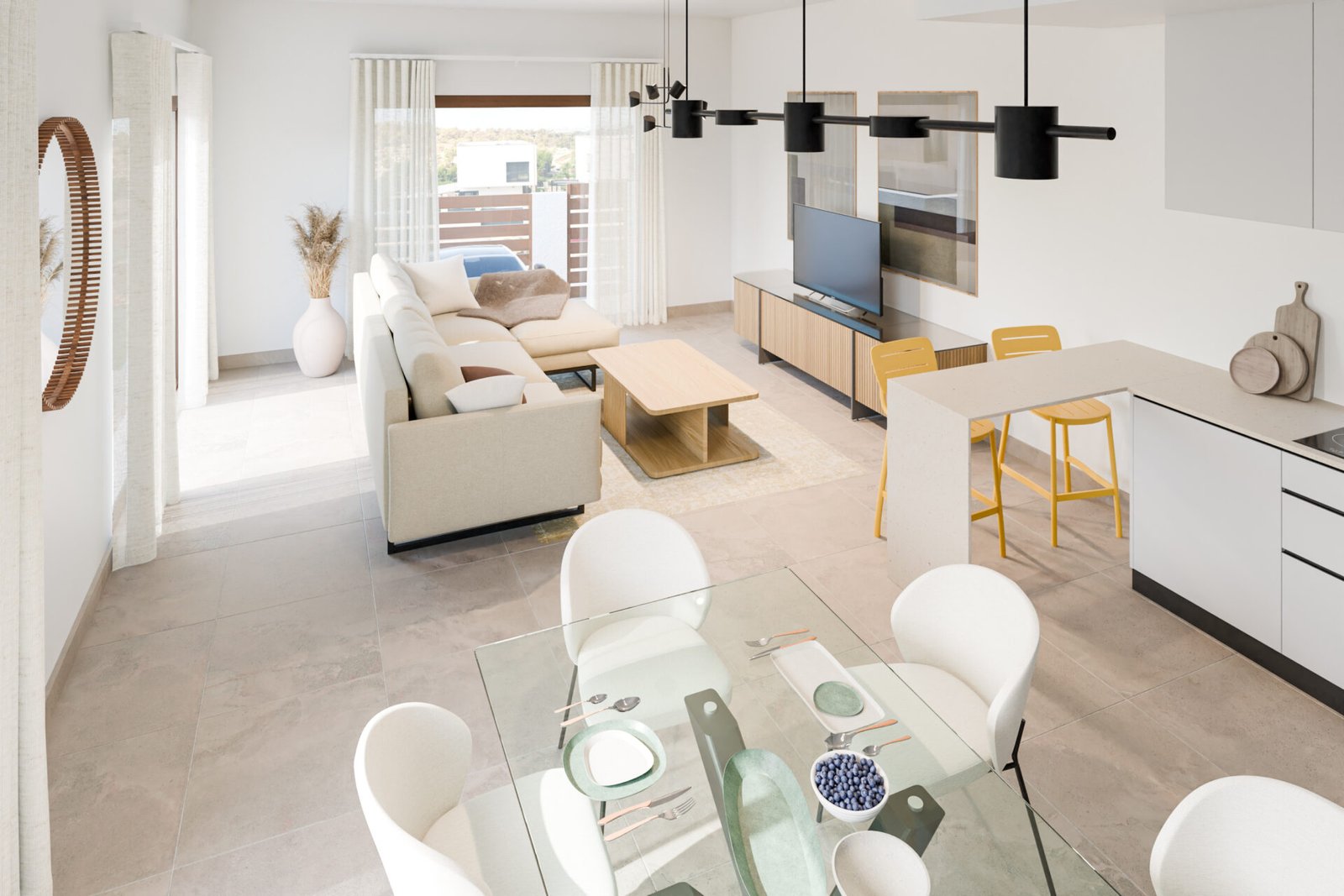 Villas Toulouse: These homes feature 3 bedrooms and 2 baths in a charming single-level design. The open-plan living-dining-kitchen area is exceptionally welcoming and harmonizes perfectly with the natural and bright surroundings typical of our villas.